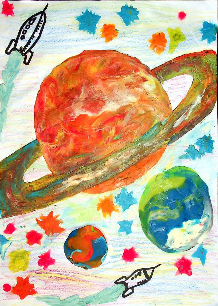 Скопление планет. Пластилинография, фон рисование карандашами.