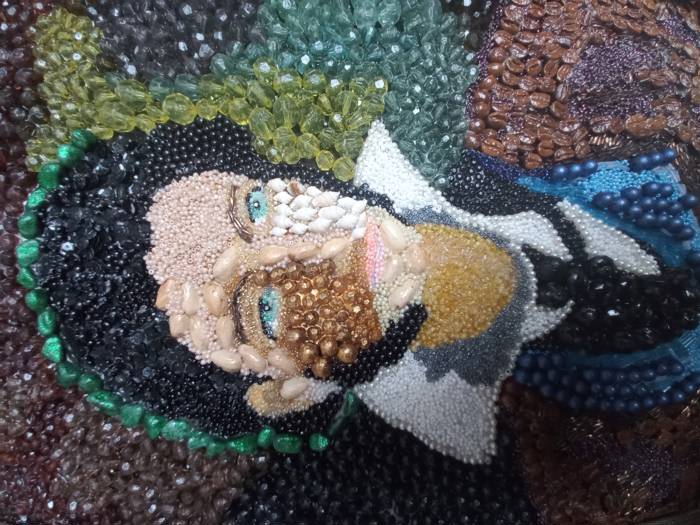 Пушкин. Декоративное панно: бисер, пайетки,мрамор, бусины акриловые, лак, зерна кофе, стразы.