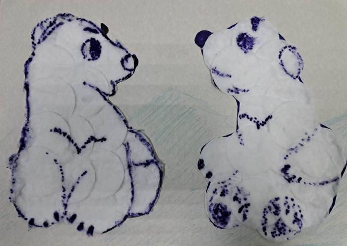 Белые медвежата. Поделка сделана ватными дисками и зарисована маркером