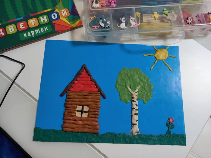 "Домик в деревне". Материалы изготовления: цветной картон, пластилин.
