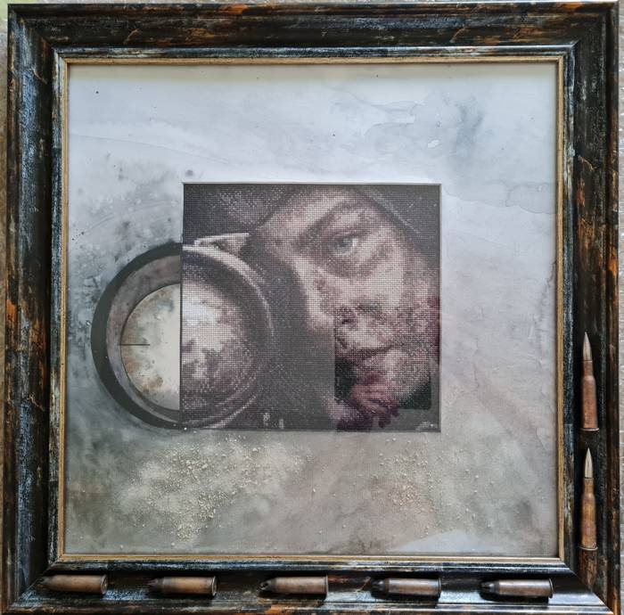 "Снайпер" - работа выполнена в виде вышивки и оформлена в паспарту с напылением крошки Севастопольской земли. Рамка украшена гильзами от патронов.