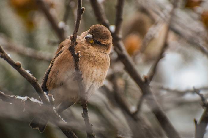 Любопытство. Воробьи – очень любопытные птицы. Этот кадр был запечатлён в то время, когда в холодные зимние дни представители этого вида птиц ищут пищу. Главным источником пропитания воробья в нашем городе является мальва – травянистое растение, цветы которого превращаются в семена в зимний период.